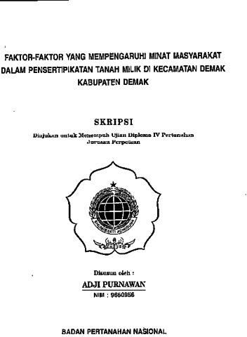 ADJI PURNAWAN, 9650956 (2021) FAKTOR-FAKTOR YANG MEMPENGARUHI MINAT MASYARAKAT DALAM PENSERTIPIKATAN TANAH MILIK Dl KECAMATAN DEMAK KABUPATEN DEMAK. Diploma thesis, Sekolah Tinggi Pertanahan Nasional.