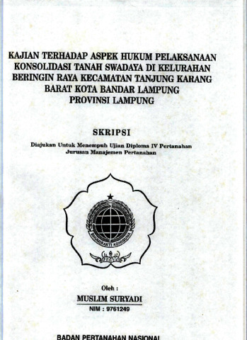 MUSLIM SURYADI, 9761249 (2021) KAJIAN TERHADAP ASPEK HUKUM PELAKSANAAN KONSOLIDASI TANAH SWADAYA DI KELURAHAN BERINGIN RAYA KECAMATAN TANJUNG KARANG BARAT KOTA BANDAR LAMPUNG PROVINSI LAMPUNG. Diploma thesis, Sekolah Tinggi Pertanahan Nasional.